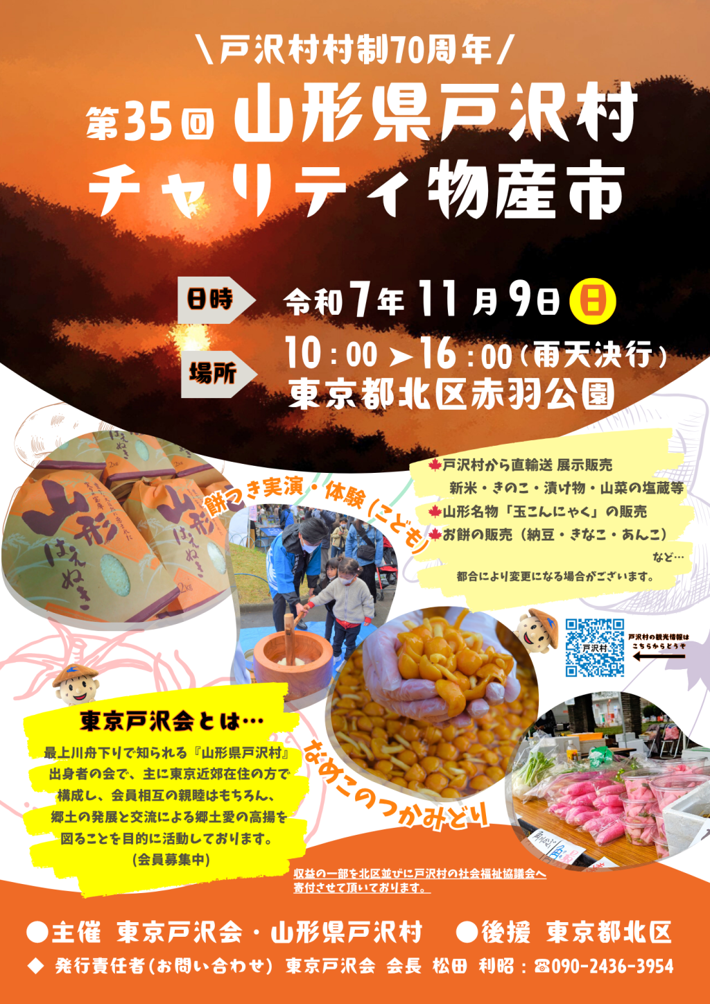 東京戸沢会メンバーが中心となり、毎年東京都北区赤羽公園にて開催されている山形県戸沢村チャリティ物産市。採れたての新鮮野菜や新米、きのこなど戸沢村の旬の食材を村観光物産協会関係者や村内の農業関係者らの手で直接販売などが行われるイベントです。※収益の一部を戸沢村及び北区の社会福祉協議会に寄付させていただきます。